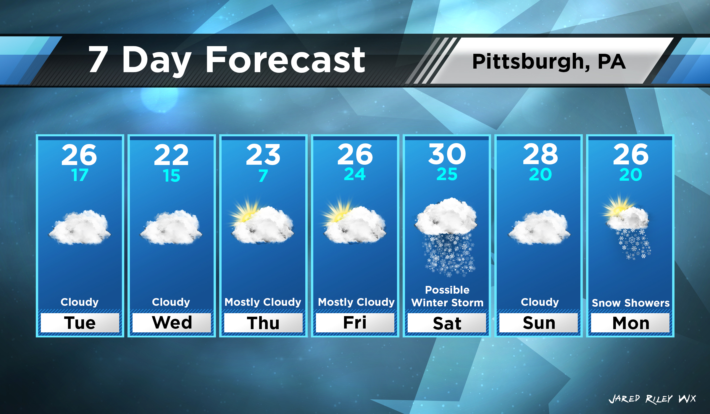 This is your upcoming 7 day forecast for Pittsburgh, PA. After this flop of a winter storm (for areas north of Pittsburgh) passes through, we will see a very cold week. We may see a few flurries on Tuesday but no accumulation. Thursday will see a VERY cold night. Lows will be in the single digits and wind chills could drop below 0. On Saturday I am monitoring for a possible winter storm to pass through. At the moment it looks like a classic Nor’easter type storm. What does that mean for us? Most likely we will see some wide spread snow showers. Possibly heavy at times. We could see a few inches, but it is still way too early to tell. After this storm, we may see some isolated snow showers on Monday. In summary, it will be a very cold week with a possibility of a storm this weekend. I will make sure to post storm updates as they come in!