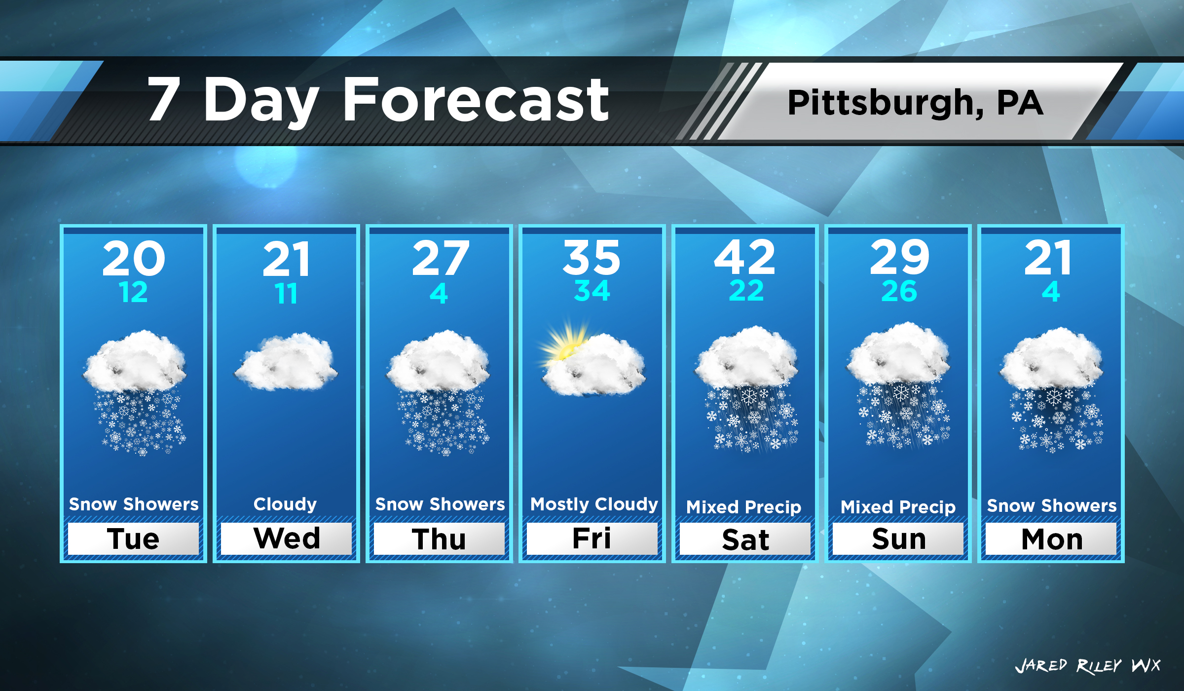 This is your upcoming 7 day forecast for Pittsburgh, PA. We can expect to see some snow showers over the upcoming week. Currently I am not expecting any major accumulations. We will see a very brief warm up Friday into Saturday before another bitter cold spell takes over. Saturday we will see some sort of precipitation. It will most likely begin as rain and transition to snow as the temperature drops back below freezing. We will see some nights in the single digits and windchills below zero. Check back for any updates!