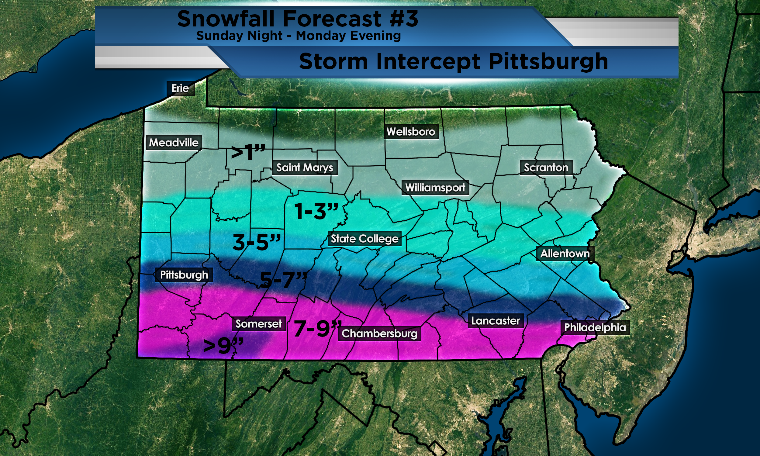 This is my third forecast for the total snowfall for the upcoming winter storm headed for our area. All Winter Storm Watches have been upgraded to Winter Storm Warnings. Winter Weather Advisories have also been added to the counties north of the warnings. Since my last forecast, I have shifted higher totals south. There will be a very tight gradient with the totals. If the storm shifts even 10 miles, those in the 5-7″ range could end up in the 1-3″ range or 7-9″ range depending. If the storm shifts, it will more likely shift north meaning higher totals for more areas. This will likely have some major impacts on travel tomorrow morning. Timing of this storm will begin in most places around midnight and end around 7-9pm on Monday. Frigid temperatures will likely freeze any slush and blown snow on the roadways. Limit your travel on Monday. If you have to leave, make sure you have a plan in place. Always keep extra layers in your vehicle along with an emergency kit. Keep an eye on my social media pages in the event something rapidly changes.