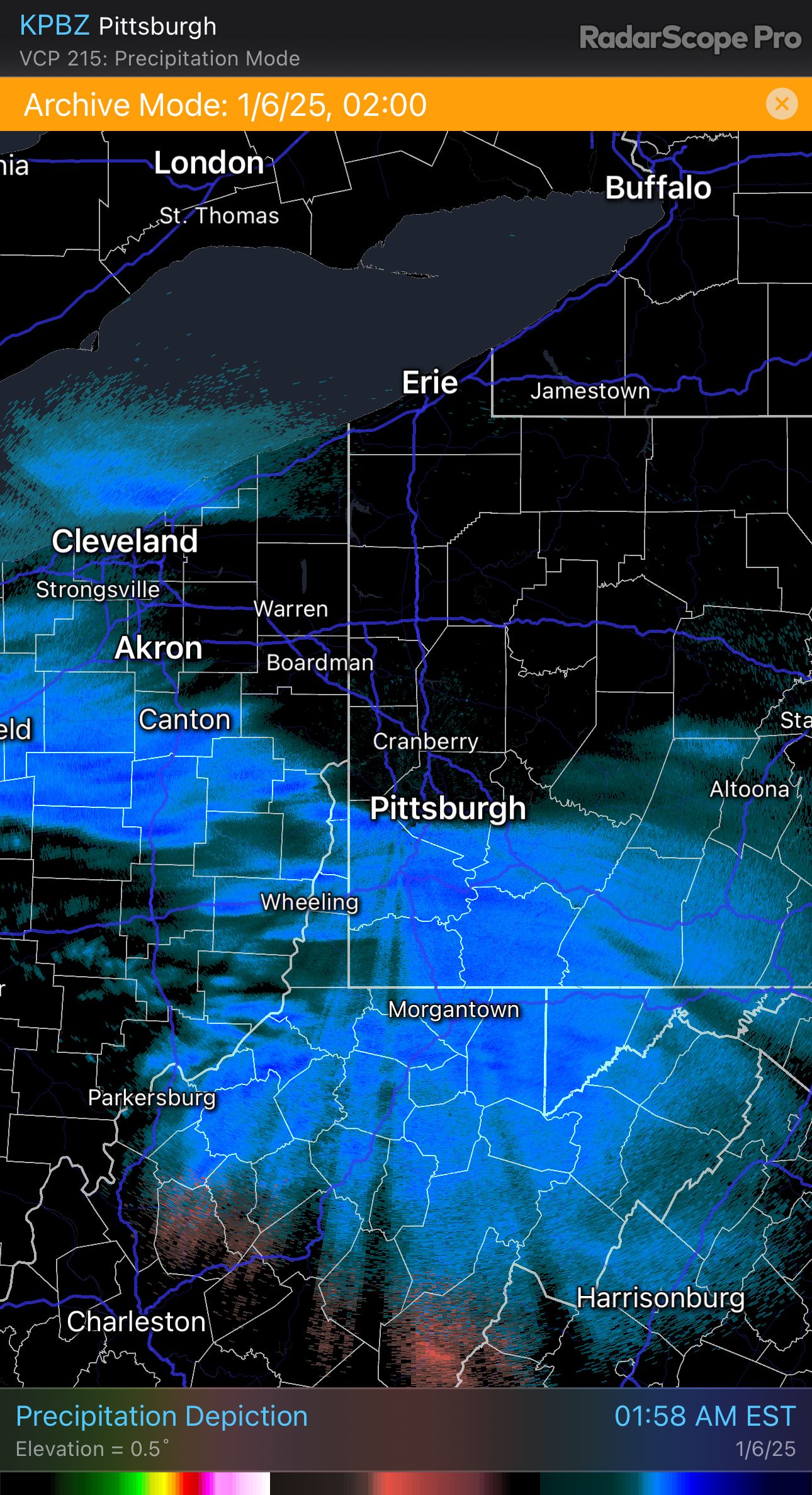 This second image is from 1am on Monday. Heavy snow is still falling generally south of I-70. You can see that the sharp line has only slightly moved in the past hour. The dry air above Pittsburgh is still in place.